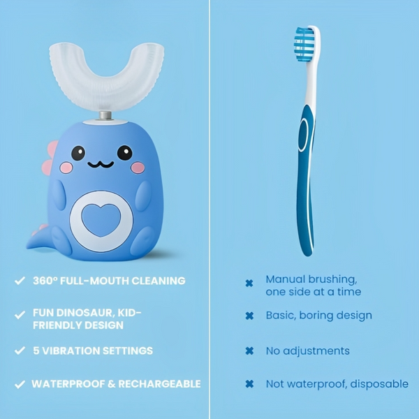 Mit dem Brushasaur™ wird das Zähneputzen zum Spiel. Die lustige Form und sanfte Vibrationen machen es kinderleicht und angenehm, sodass Kinder gerne mitmachen. Ihre tägliche Routine wird zur freudigen Erfahrung.