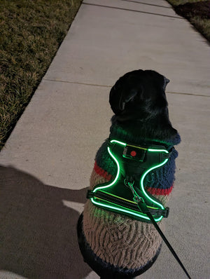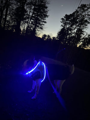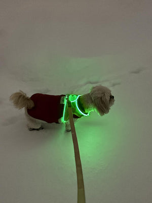 Erleben Sie sorgenfreie Spaziergänge mit Ihrem Hund bei Dunkelheit und schlechtem Wetter, dank des leuchtenden Hundegeschirrs.