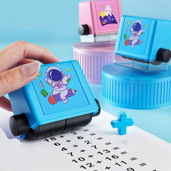 Einfach den Stempel auf Papier rollen. Er druckt zufällige Matheaufgaben, die Kinder lösen können.